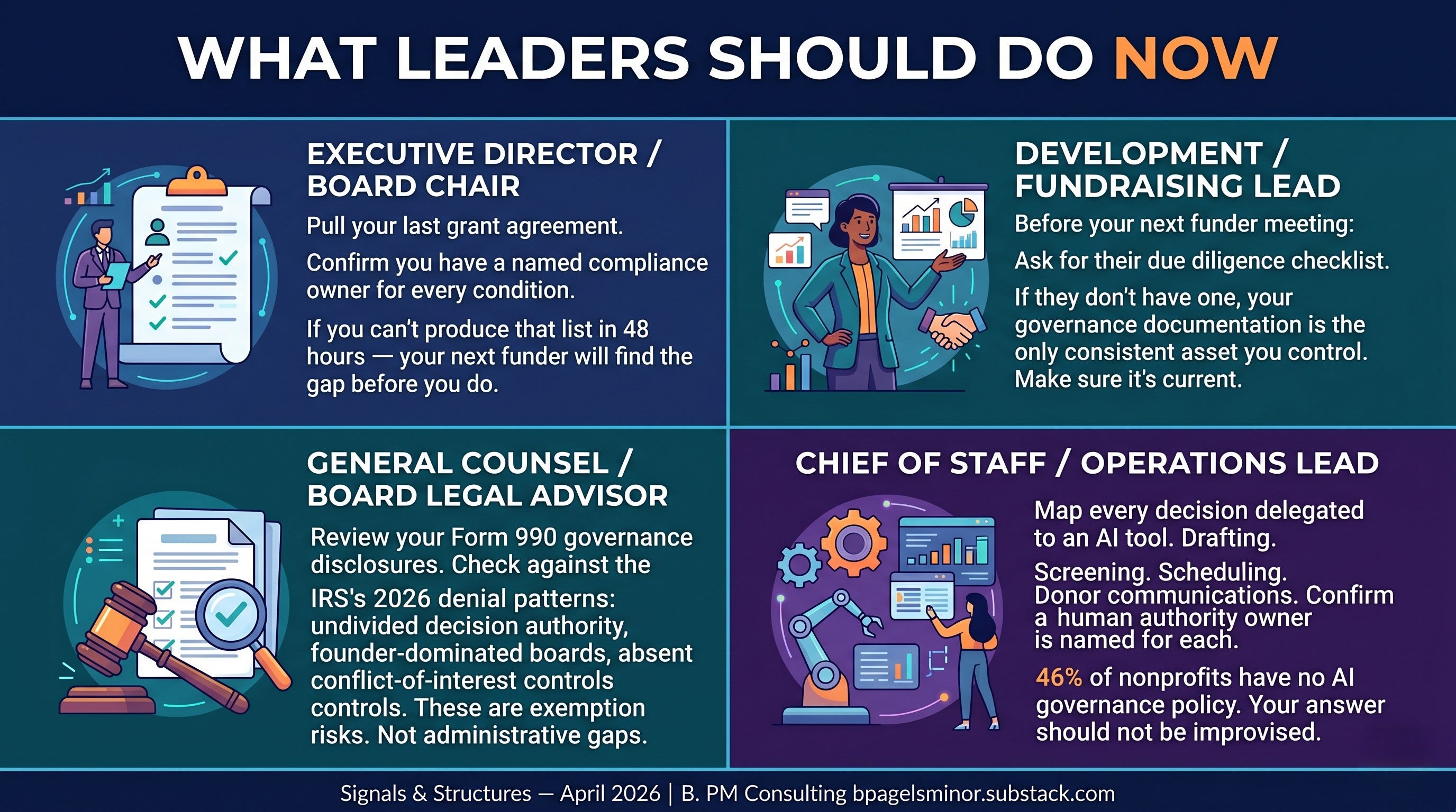 Chief of Staff / Operations Lead: Map every operational decision currently delegated to an AI or automated tool — drafting, screening, scheduling, donor communications — and confirm a human authority owner is named for each. The 2026 Nonprofit AI Adoption Report found that 46% of nonprofits have no formal AI governance policy. Funders are beginning to ask this question during intake. Your answer should not be improvised.