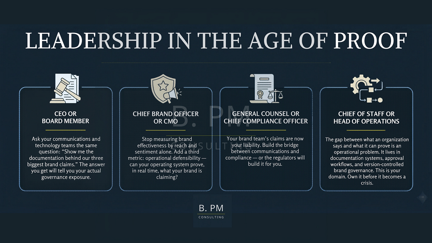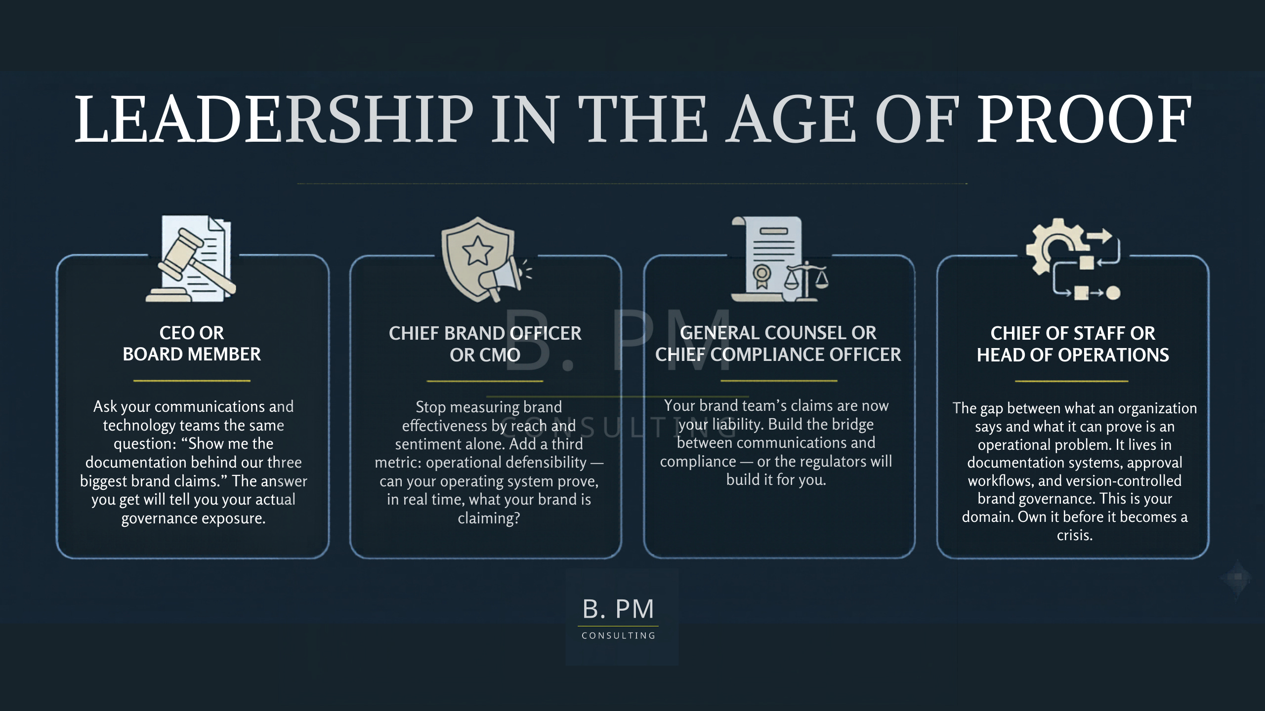 If you are a Chief of Staff or Head of Operations: The gap between what an organization says and what it can prove is an operational problem. It lives in documentation systems, approval workflows, and version-controlled brand governance. This is your domain. Own it before it becomes a crisis.